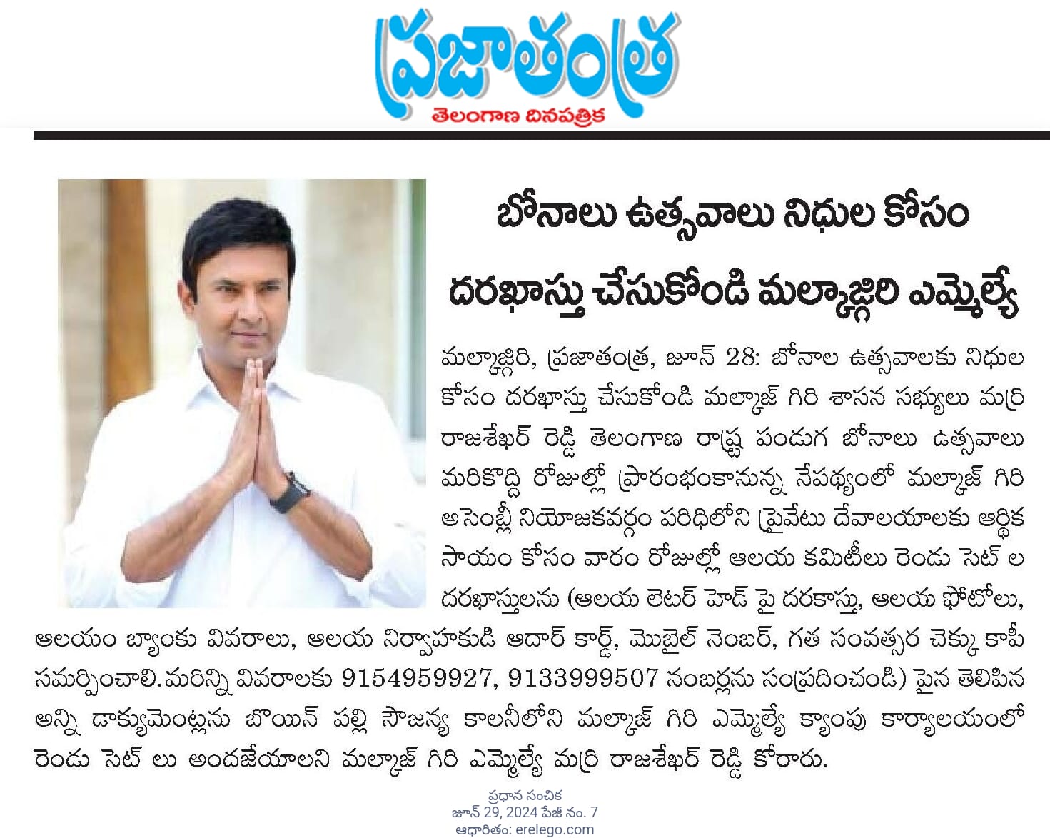 బోనాలు ఉత్సవాలు నిధులు కోసం దరఖాస్తు చేసుకోండి – మల్కాజ్గిరి ఎమ్మెల్యే